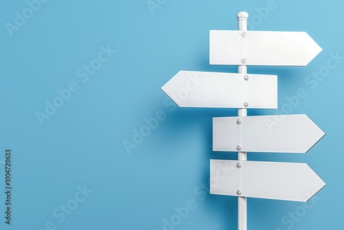 A white sign with four arrows pointing in different directions. The sign is on a blue background. The sign is meant to be a symbol of guidance or direction