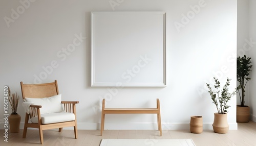 A white square frame hanging on a white wall, with a wooden chair and some decorative objects on the floor in front of it.