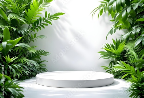 A White Stage empty Podium Surrounded by Lush Greenery Display Nature background