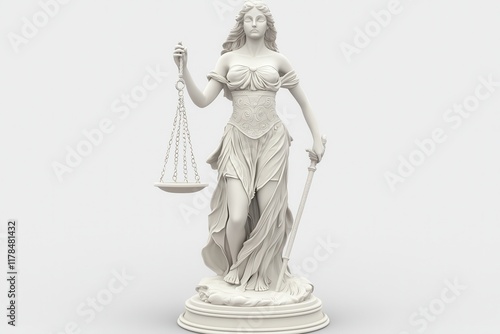 A white statue of Lady Justice, holding scales and a sword, symbolizing fairness, law, and equity in a minimalist style.