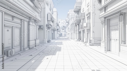 A white street with a few buildings and a few people