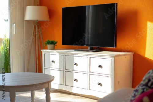 A white television stand with a black television on it