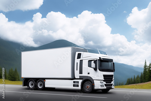 A white truck is driving on the road. Clean and empty space in the side view. Beautiful summer landscape as background, blue sky with clouds, forest and hill. Generative AI.