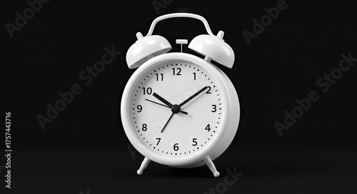 A white vintagestyle alarm clock with bells and a legible face shows a time of 1009 on a black background