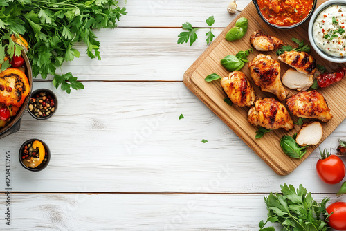 a white washed wood table scene with spicy chicken dishes from above