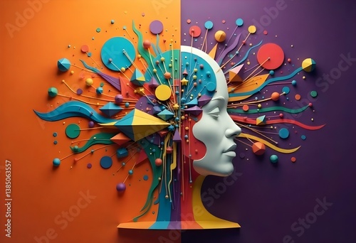 A white woman head with 25 years old with colorful geometric shapes , brain and lines coming out of the head in a orange and purple background