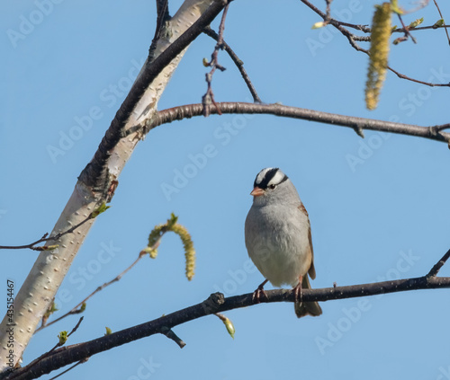 A White-crowned Sparrow (Zonotrichia leucophrys) in a tree under blue sky