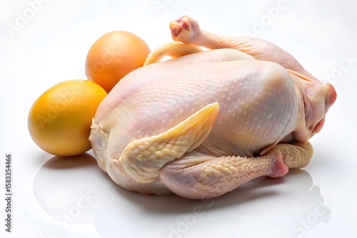 A whole raw chicken and two eggs isolated on a clean white background, ready for cooking
