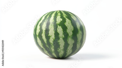 A whole, ripe watermelon with green stripes isolated on a white background.