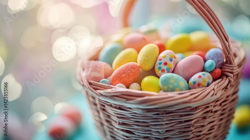A wicker basket filled with colorful decorated sugary candies