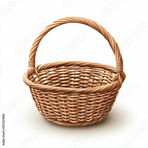 A wicker basket with a rounded handle, intricate texture, and natural brown color on a clean white background.
