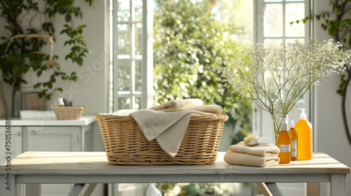 A wicker basket with fresh towels and cleaning supplies
