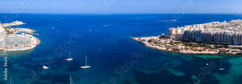 A wide aerial view shows Sliema, Malta, with two peninsulas, small sailboats, speedboats, rocky shores, hotels, a resort and marina, and bright blue waters at midday.