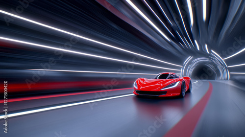 A wide cinematic view of the tunnel’s sweeping lines, the red supercar in sharp focus at the