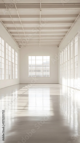 A wide, empty exhibition space with white walls, natural light streaming through windows, and a polished floor, perfect for product displays and text integration