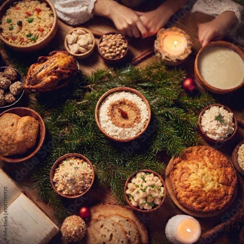A wide flatlay of a Polish Christmas Eve celebration with a split diopter, focusing on detailed religious elements such as small religious ornaments and prayer books, while also capturing the full