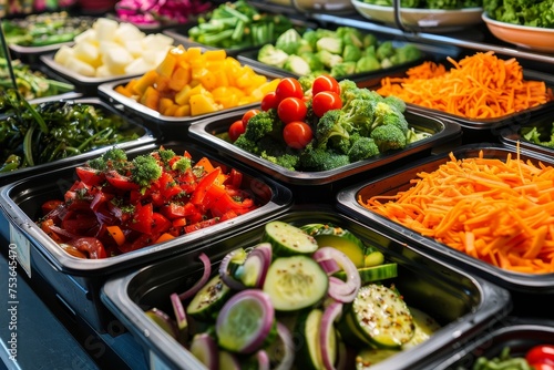 A wide range of colorful fresh vegetables cut and ready to serve in a self-service salad bar setup