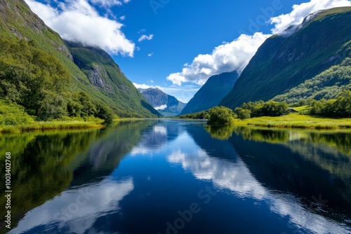 A wide river meandering through a valley, with towering mountains on either side and clouds reflected in the water’s surface
