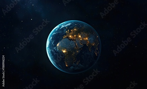 A wide shot of the Earth from space, with glowing city lights on its surface and interconnected lines representing global connectivity and data flow, against a dark background.