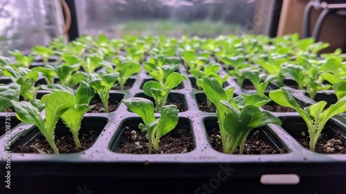 a wide shot or top shot of true leaves of romaine in seedling tray in hydroponics in the philippines