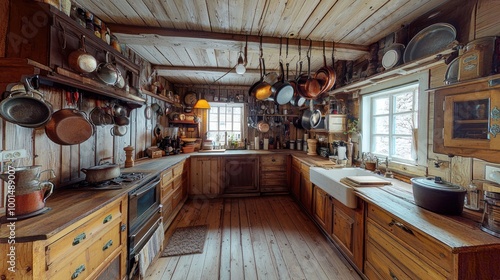 A wide-angle photograph of a rustic kitchen, with wooden cabinets, hanging pots, and vintage decor.