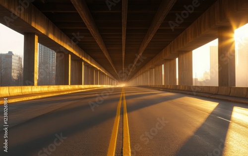 A wide-angle view of a highway beneath a bridge in New York, during the early morning hours. The empty road has a soft mist around the concrete pillars