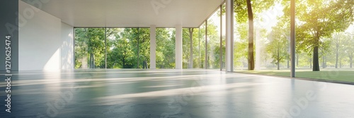 A wide-angle view of an empty concrete floor with tall glass windows overlooking the park, a light gray and white color scheme, architectural