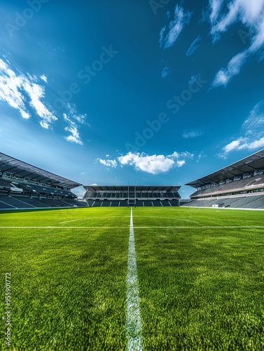 A wide-angle view of an empty rugby stadium under a clear blue sky with white clouds. The green grass field is pristine, ready for the next game. The stadium stands tall, symbolizing the potential fo