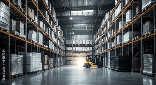 A wide-angle view of an industrial warehouse with high shelves filled with boxes and pallets
