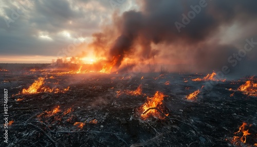 A wildfire spreads uncontrollably through dry fields under a stormy sky, a natural emergency scene