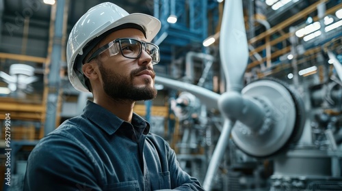 A wind turbine engineer wearing a hard hat, closely examining a renewable energy turbine, photorealistic, detailed textures, industrial setting, 8K resolution, cinematic lighting