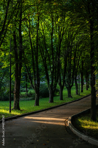 A winding asphalt road in a lush green park with tall trees on both sides, sun rays filtering through the leaves.