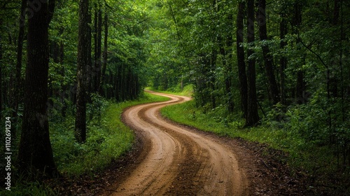 A winding dirt road cutting through a dense forest, inviting adventure and exploration.