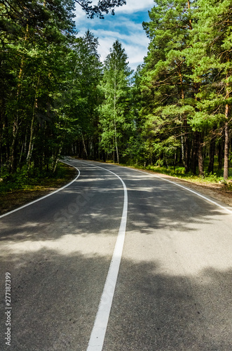 A winding mountain road at sunset in a pine forest. Serpentine. Sun rays light and shadow sun