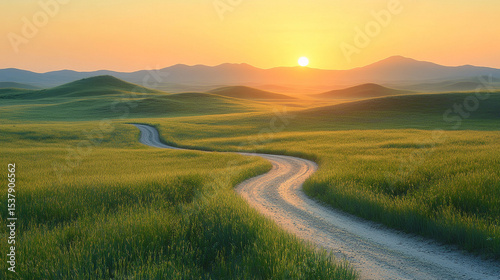 A winding path cuts through lush green hills under a glowing sunset sky—symbolizing journey, peace, freedom, and the natural beauty of evening light over a serene landscape.