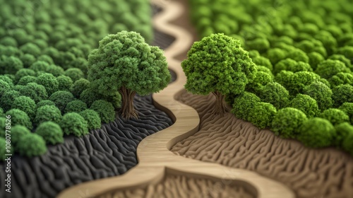 A winding path divides lush greenery from barren land, symbolizing environmental contrast, AI