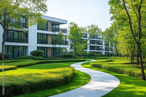 A winding path through a green landscape leads to modern white residential buildings surrounded by trees