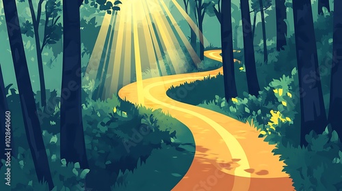A winding path through a sun-dappled forest, leading towards a bright light.