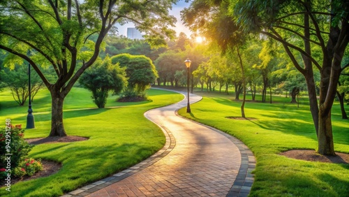 A winding pathway in a lush green park , path, park, nature, trail, walking, outdoor, serene, tranquil, beautiful, landscape