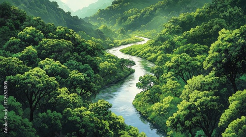 A winding river cutting through a lush forest, rich green foliage on either side, peaceful and serene