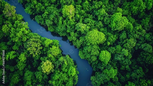 A winding river flows through a dense forest, with lush green trees and a blue sky in the background.