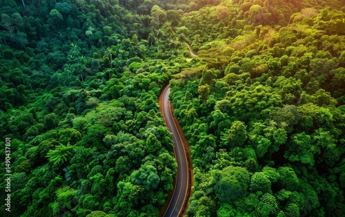 A winding road cuts through a dense, lush green forest under vibrant sunlight, showcasing nature"s beauty and tranquility.