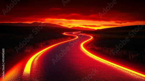 A winding road illuminated by vibrant red light against a dramatic sunset backdrop.