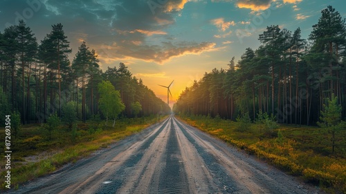 A winding road through a lush forest at sunset, bathed in golden light. The scene evokes a sense of peace and tranquility.