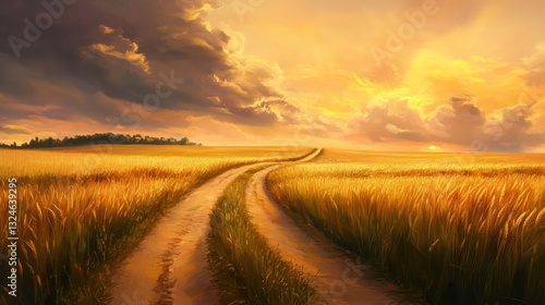 A winding rural dirt road leads through a golden wheat field