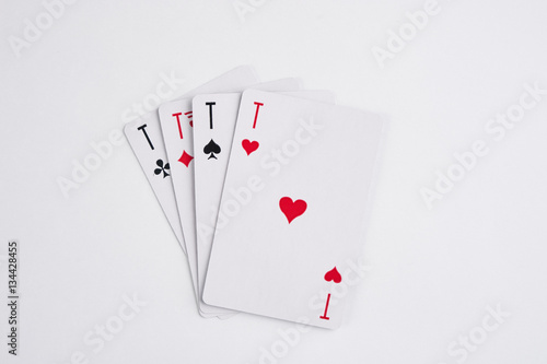 A winning poker hand of four aces playing cards suits on white