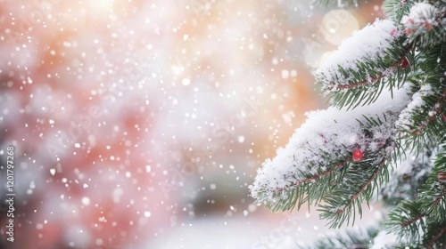 A winter background image showing snow falling on pine tree branches with blurred lights in the background