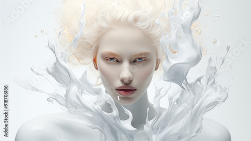A winter beauty photo of a charming blonde angelic woman, elegantly and charmingly made up, while taking a milk bath.