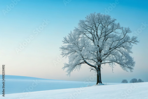 A winter landscape with a large tree in the foreground and two smaller trees in the background. The sky is blue and the sun is setting