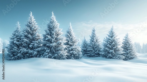A winter landscape with snowy fir trees beneath a bright blue sky captures a moment of peace.